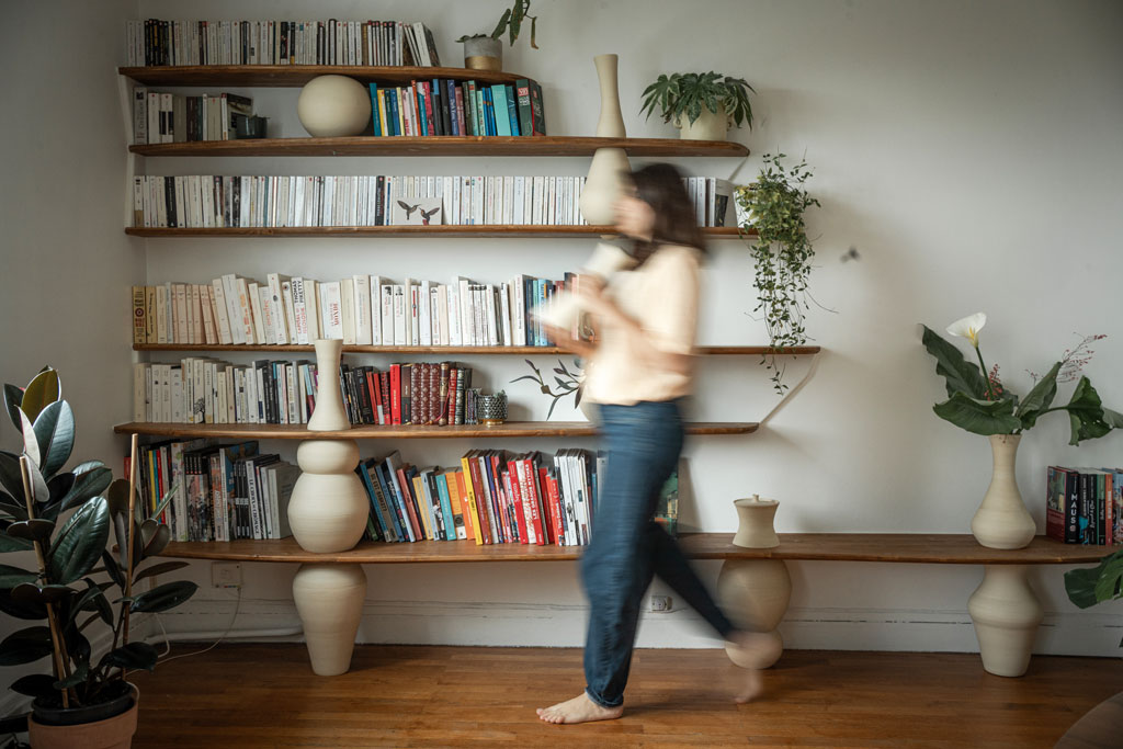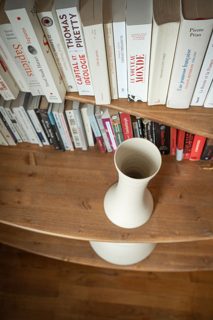 Une commande unique qui nous a donné l’occasion de tenter l’expérience de mixer ces 2 matériaux, ici entièrement travaillés à la main. Cette bibliothèque organique associe étagères en bois massif et céramiques réalisées par tournage. Ces dernières sont tantôt structurelles, tantôt mobiles et fonctionnelles pour exposer ses plus belles plantes ou ranger des petits accessoires.