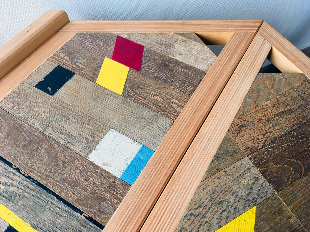 Entièrement réfléchi et fabriqué à partir de matériaux de réemploi, et dans cette démarche de seconde vie, il propose habilement une inversion des fonctions : le sol devient plateaux et les plateaux deviennent pieds. Il se compose d’un plateau fabriqué à partir de l’ancien parquet du gymnase Brossolette à Villeurbanne (collecte Minéka matériaux). Les pieds sont issus d’établis d’artisans maroquiniers. Le caisson, lui, est fabriqué à partir d’anciens décors du TNP_Villeurbanne, comme en témoignent les marquages techniques encore visibles. La fabrication soignée est assurée par l’Atelier Emmaüs.
